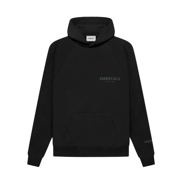 This black Fear of God Essentials Pullover Hoodie was released in December of 2021 as a part of the brand’s Core Collection. Fear of God Essentials Pullover Hoodie is made of a black cotton/viscose blend and features a rubberized logo on the wrist, chest, and hood. In terms of fit, this hoodie was designed with dropped shoulders and stylized volume in the body creating a spacious drape.