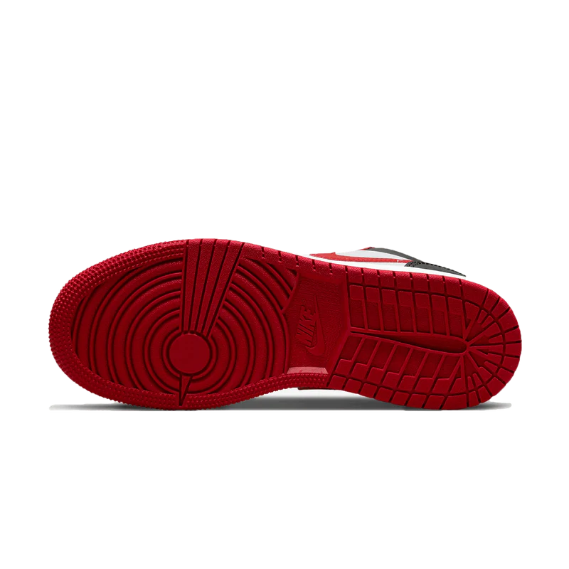 The Air Jordan 1 is constructed in the full leather, featuring mesh tounges and lining. The shoe has a crisp, white base with red and black overlays. The crimson Swoosh sits atop the white midsole while the rubber outsole matches the branding in color.